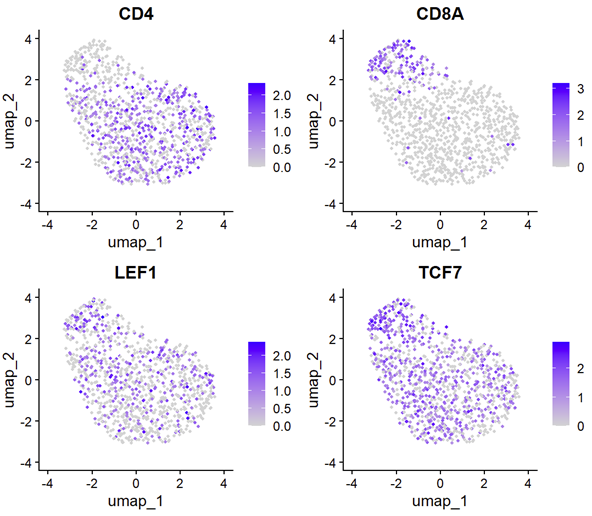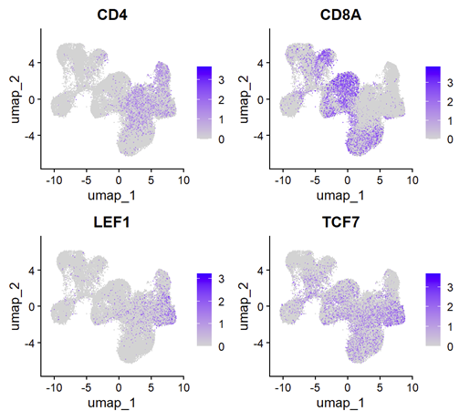 FeaturePlot(subcd8naive,features = c('CD4','CD8A','LEF1','TCF7'), order = F)