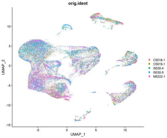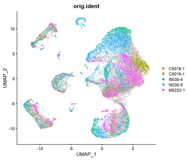 可以看出在上图中不同批次的细胞的颜色分布是不太均匀的。尤其是上面的一簇,基本是蓝色的,中间偏右的一大簇里面也可以看到有较为明显的界限。接下来看看我使用seurat包处理过后的数据图像。
